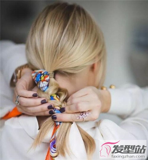 步骤1:首先将丝巾对折,在丝巾中间处用皮筋将头发和丝巾其中一条绑起来。