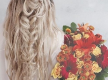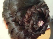 Step 2:每编一次加进一股新的头发,直至吧头顶上的头发都加进发辫,然后均分成两股用卡子在左右固定。