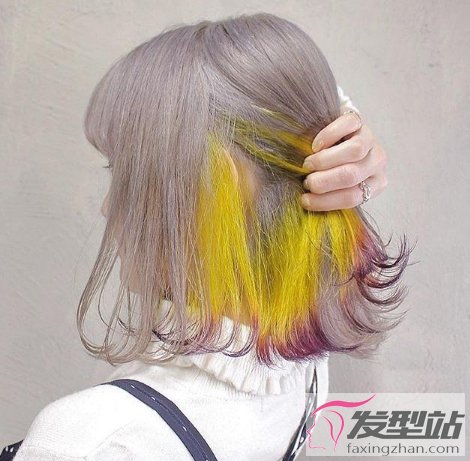黄色+紫色的隐藏染设计特别个性时尚,搭配中短外翘短发,时髦指数百分百。