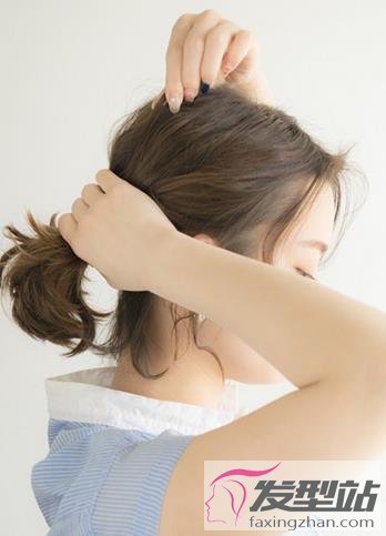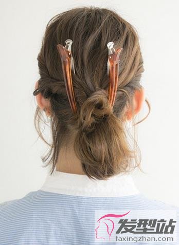 把高低两层的头发先各自拧转一下,然后把这两束头发彼此交叉扭转,拧成一束较大的发辫,并把辫尾拉向马尾处。