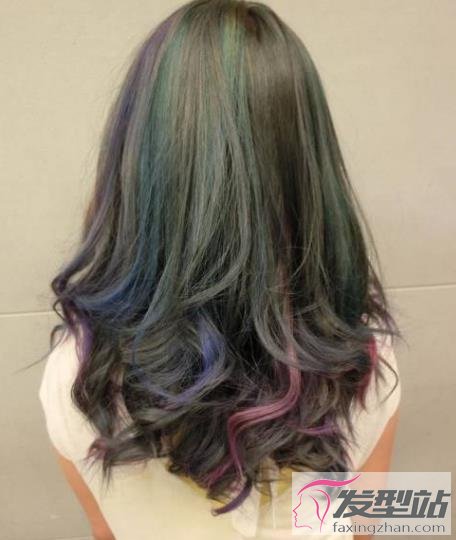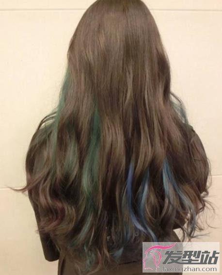 棕色的发色中加入绿色和蓝色的挑染,这样的造型也很不错,半直半卷的发丝尽显时尚气质。