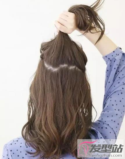 2、用皮筋扎住,从中间部位掏过去,头顶部分就显得有型。