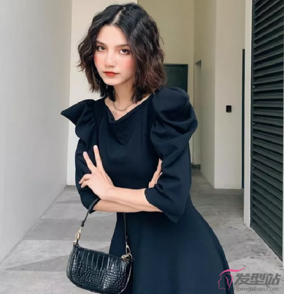 略带凌乱感的短卷发,这款卷发的卷度不明显,中分齐脖长度的头发,简单的修饰出精致小脸。