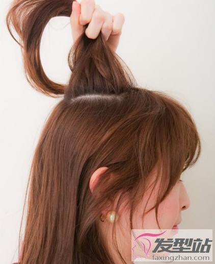 2、沿着刘海从头顶取出一束头发。