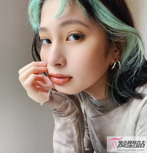 齐肩长度的人鱼卷短发,勾勒出细长的天鹅颈线条。浅绿色的挑染搭配,更是清新可爱。