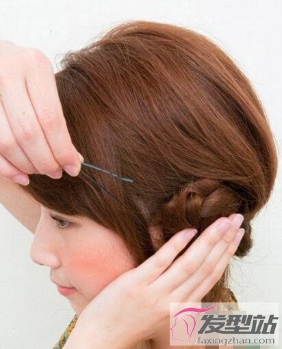 7、缠绕成花朵状,用发夹固定。