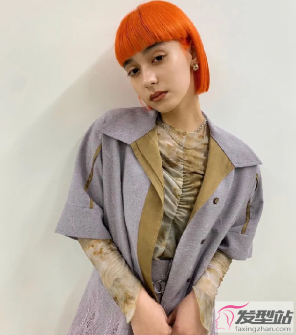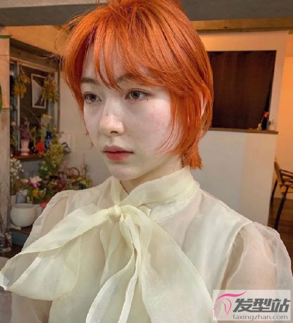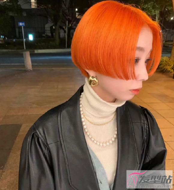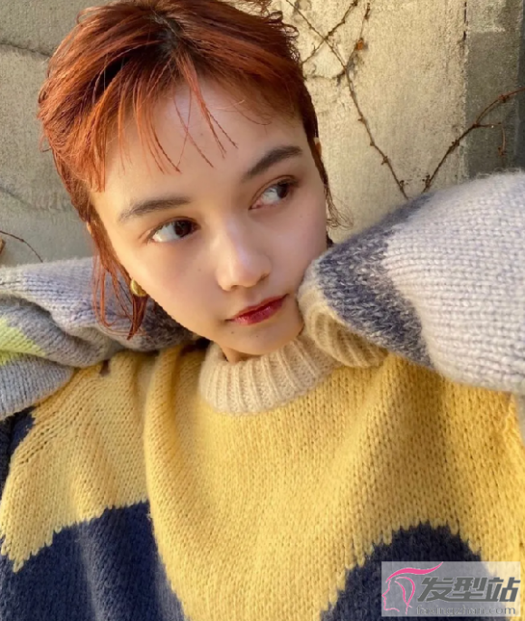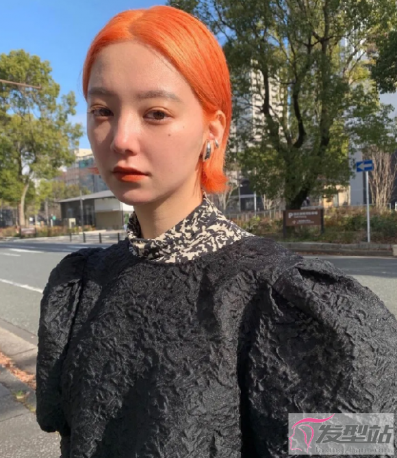 暗橙色发色相对来说低调轻熟一些,短刘海半扎短发本就个性,和橙色的组合更是潮酷。