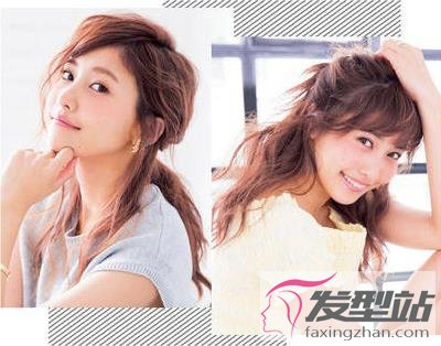 1、卷发侧分,在头顶处取一小束头发往侧边放当做散落的长刘海。(不是卷发的妹子应该先用卷发棒将自己的头发弄卷曲,在开始扎发。)