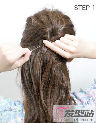 2、将右下侧的头发扭转,盖住半束头发的末端,用一个隐形的夹子固定住。然后左下侧的头发被扭曲,用不可见的夹子固定。