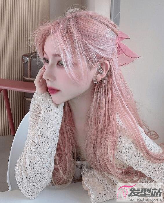 长发樱花粉发型,头发随意半扎起来,戴上粉色蝴蝶结发饰,这样的发型美到让你移不开眼睛。