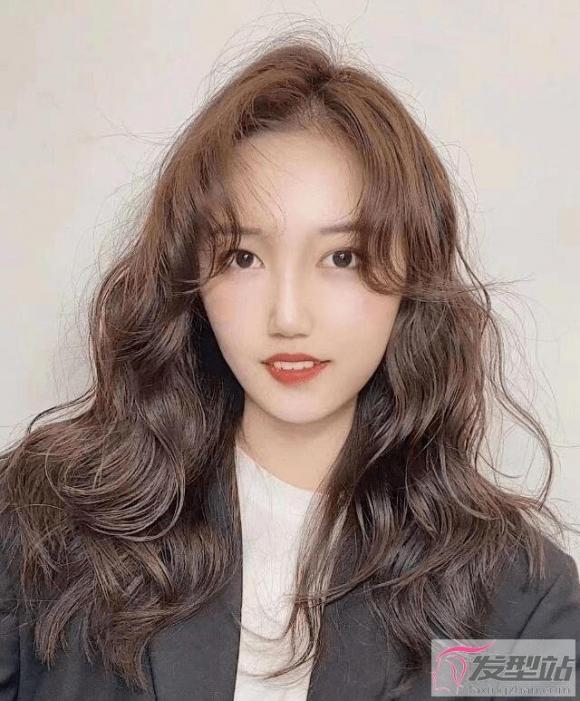 长发造型烫和八字刘海的的搭配就很好看,卷度自然唯美,连发根也烫出一个弧度,更不会贴头皮。