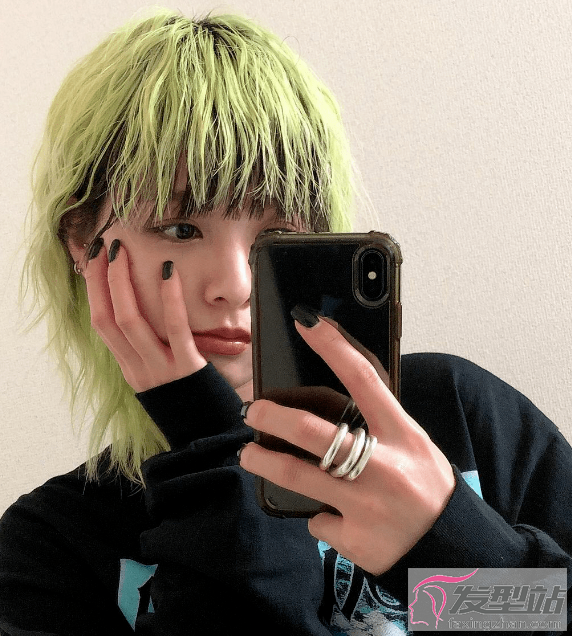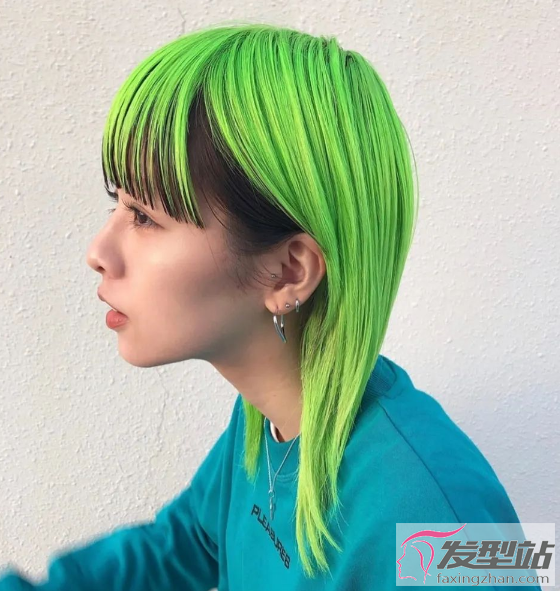 荧光绿发色,底层头发依然保持黑色,塑造出双层染的效果,时髦又吸睛。