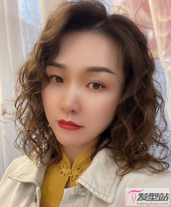 羊毛卷中长发发型,头发从发根一直烫到发尾,卷曲的头发蓬松随性,非常适合发量少的女生。