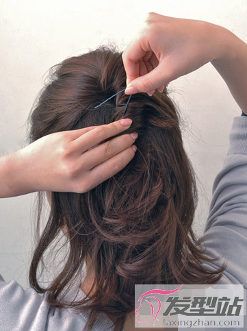 4、再将尾部拉扯到左侧继续用发夹固定。