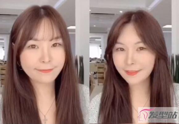 剪出能修饰脸型得法式刘海其实很简单!首先抓出前额适量发丝,并将头发分成三等份,接着从中间开始剪短,切记不要剪太短,长度大约在眉毛下、眼睛上,中短外长的比例更能让脸型看起来细长且温柔。