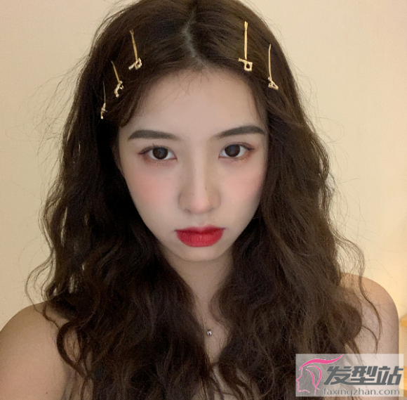 中分刘海的羊毛卷,有了字母发夹的加入,瞬间变得更加时髦个性了,画上精致的妆容,美翻全场。