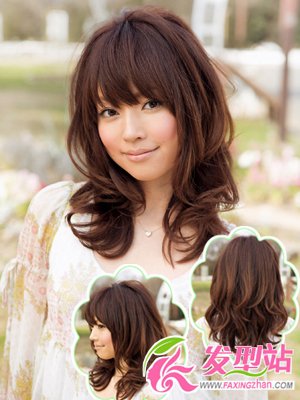 日系中长发发型Style 3:此款适合圆脸或鹅蛋脸等有点肉肉的MM,可爱中又不失女性温柔;垂直的刘海与散落的卷发组合,看上去既优雅又不显死板,咖啡般的颜色让人看到你时尚而又性感的一面,但要注意发色不要过亮,咖啡色或偏棕比较好。