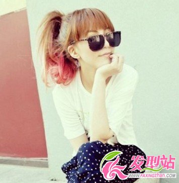 青春美丽的女生马尾发辫,发尾加上粉红色的染发色,更显青春与活力,额头自然的碎发平刘海,透着随意休闲的感觉,马尾辫发的波浪卷发的打造,垂顺感十足,很潮流欧美风格。